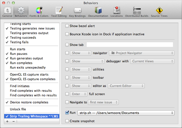 Next you need to add a behaviour to Xcode. Go to the Xcode preferences and click the Behaviours section, then click the + button. Name the behaviour and give it a keyboard shortcut. In the right pane check Run and choose the script you saved above. That’s it. Now you can kill off that nasty whitespace with ease.